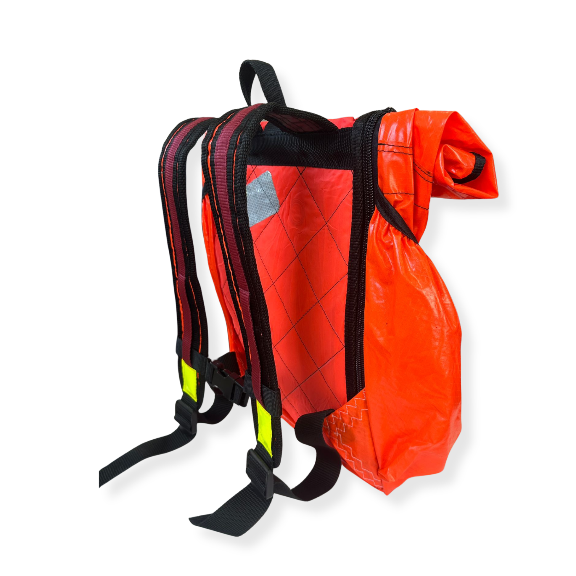 Designed for practicality and sustainability, the rolltop backpack offers versatility, style, and a rugged heritage. Made from decommissioned Royal Navy Submariners 1 person life rafts, it’s lightweight yet tough, featuring an adjustable rolltop closure to expand storage when needed. Its durable, water-resistant fabric ensures protection against the elements, making it perfect for commuters, travellers, or outdoor explorers. By choosing this backpack, you're helping to keep waste out of landfill, supporting sustainable craftsmanship, and carrying a meaningful piece of history on your back.