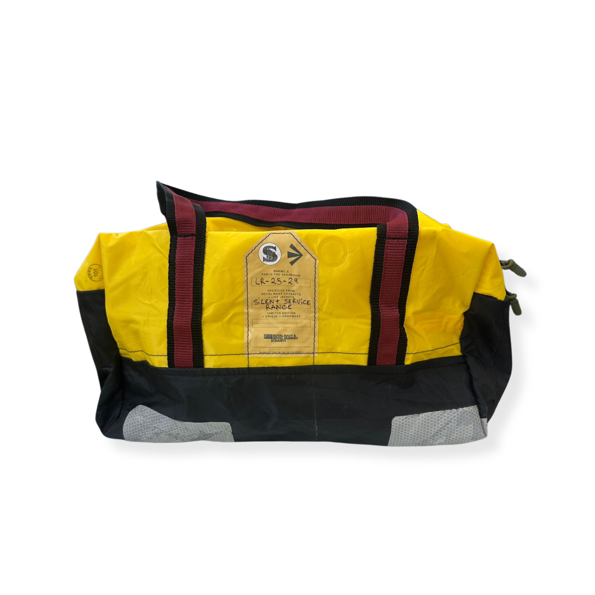 Compact yet practical, the small holdall is ideal for daily essentials, whether you’re heading to the gym, commuting, or on the move. Crafted from upcycled Royal Navy Submariners 1 person life rafts, this bag is lightweight, resilient, and water-resistant, making it both functional and environmentally friendly. By transforming life-saving equipment into stylish accessories, this holdall helps to cut down on waste and supports a circular economy, proving that sustainability and quality go hand in hand.